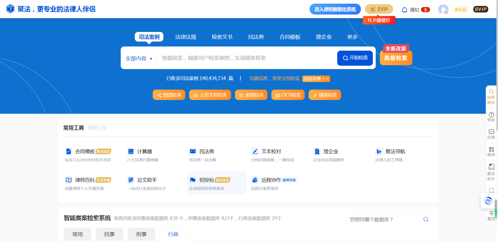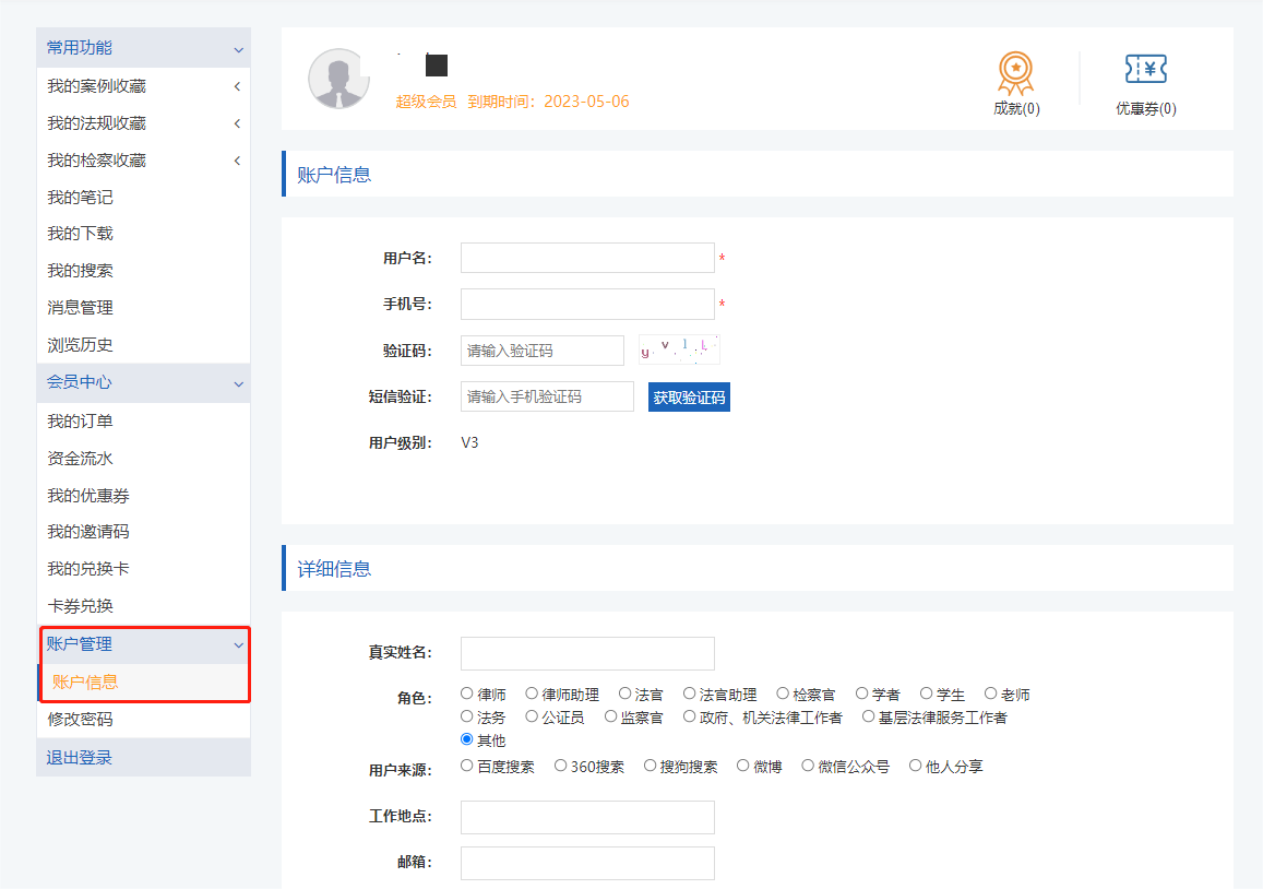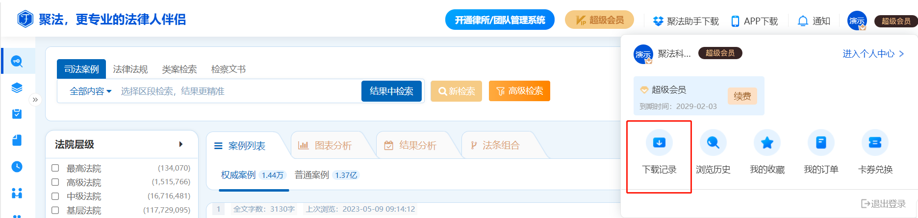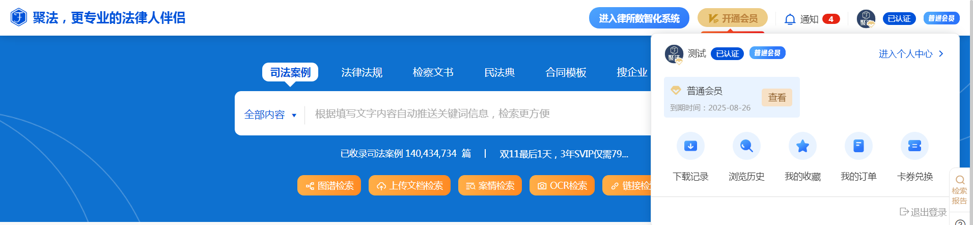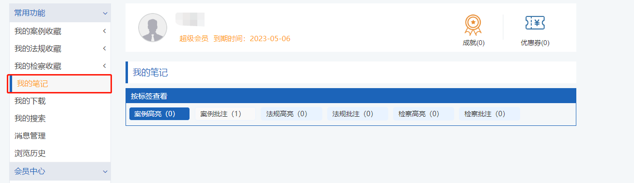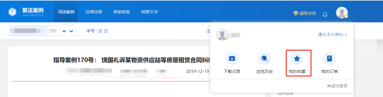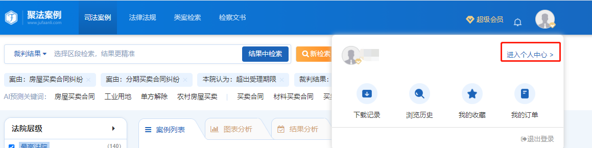 用戶登錄系統(tǒng)后,在聚法案例首頁及檢索頁面的右上角可找到個(gè)人賬號的標(biāo)識,點(diǎn)擊列表任何信息均可進(jìn)入個(gè)人中心。