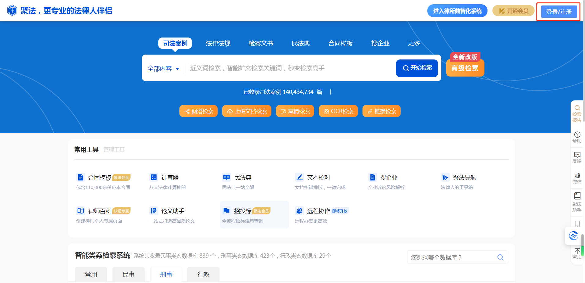 首次使用系統(tǒng)的用戶需先注冊賬號,在聚法案例首頁右上角點(diǎn)擊“注冊”,打開微信掃描二維碼的方式進(jìn)行注冊,按照要求綁定手機(jī)號并填寫驗(yàn)證碼,其余信息為選填信息。