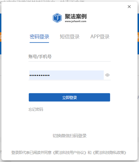 用戶在完成注冊以后,可在聚法案例首頁右上角點(diǎn)擊“登錄”,若以手機(jī)號注冊,則直接填寫賬號以及密碼登錄系統(tǒng);若以微信掃二維碼方式注冊,則可以通過微信掃二維碼方式登錄系統(tǒng)。