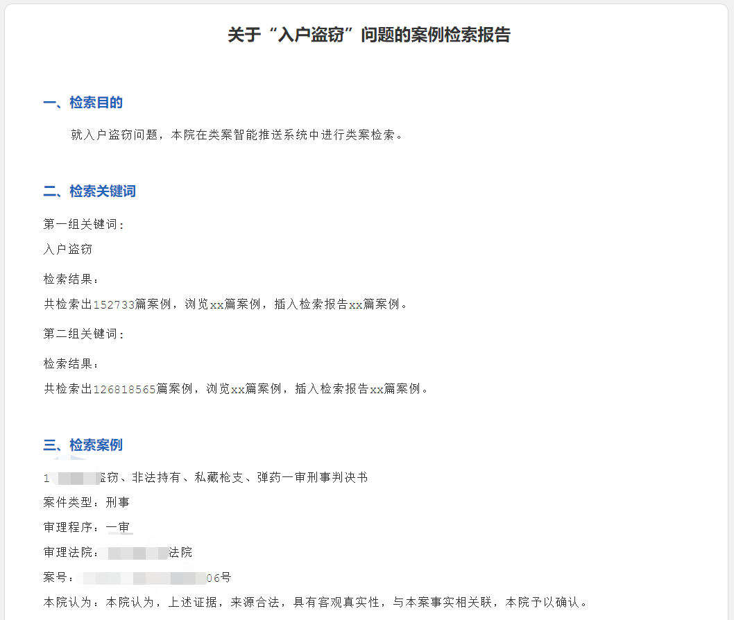 該報(bào)告主要包含檢索目的、檢索關(guān)鍵詞、檢索案例、檢索法規(guī)、檢索結(jié)論及附件六大部分。法院也可自主提供類案檢索報(bào)告模板,實(shí)現(xiàn)按需定制。