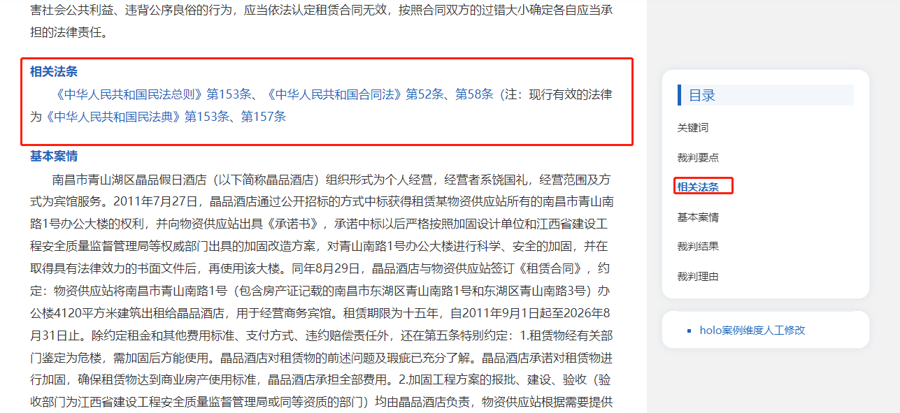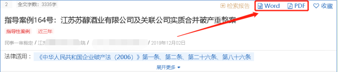 在案例詳情頁右側(cè)工具欄中,還可全面展示文中所有被引用的法條。點(diǎn)擊法規(guī)標(biāo)題即可查看法條內(nèi)容。