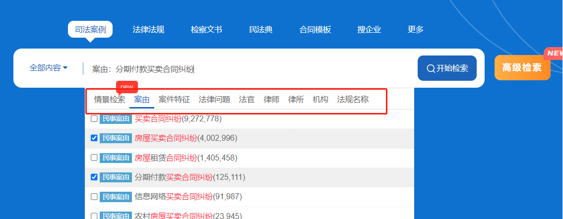 系統(tǒng)具有目前最智能的聯(lián)想檢索功能,用戶在關(guān)鍵詞輸入的過程中,根據(jù)已經(jīng)填寫的文字內(nèi)容自動推送關(guān)鍵詞等信息,點(diǎn)擊【案件特征】【法律問題】等按鈕可切換聯(lián)想庫,勾選聯(lián)想詞前的復(fù)選框可進(jìn)行多選,選擇完畢后點(diǎn)擊【開始檢索】即可,該功能能有效幫助用戶快速確定搜索關(guān)鍵詞。