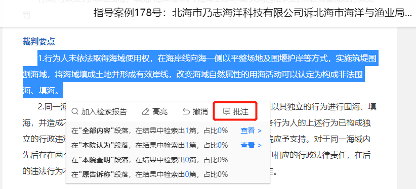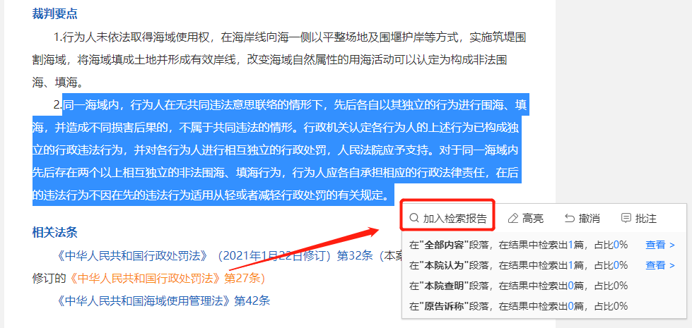 用戶在閱讀文書或者法規(guī)詳情時(shí),若想快速定位某個(gè)關(guān)鍵詞的位置,可以選中該關(guān)鍵詞,選擇添加高亮。
