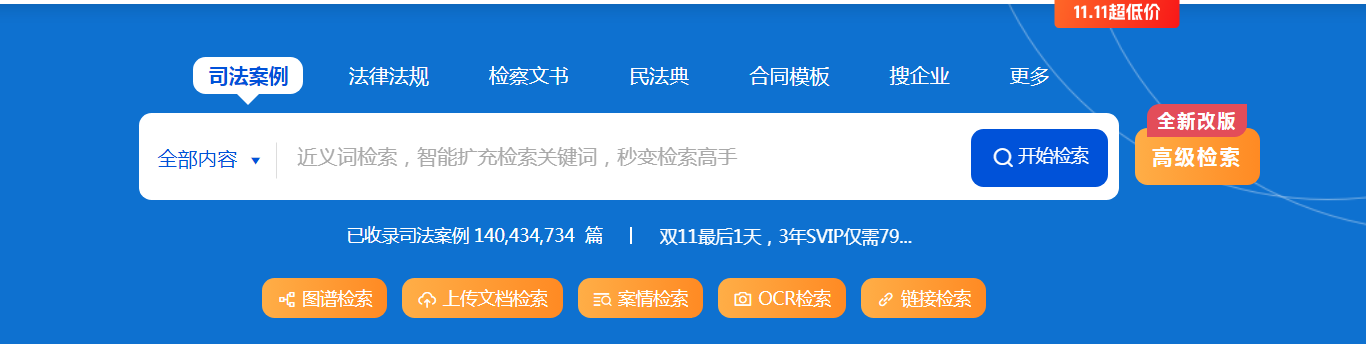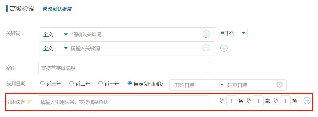 高級檢索面向具有較為專業(yè)法律數(shù)據(jù)需求的用戶,實(shí)現(xiàn)了在一次檢索中整合多種檢索維度,進(jìn)一步縮減數(shù)據(jù)檢索時(shí)間。