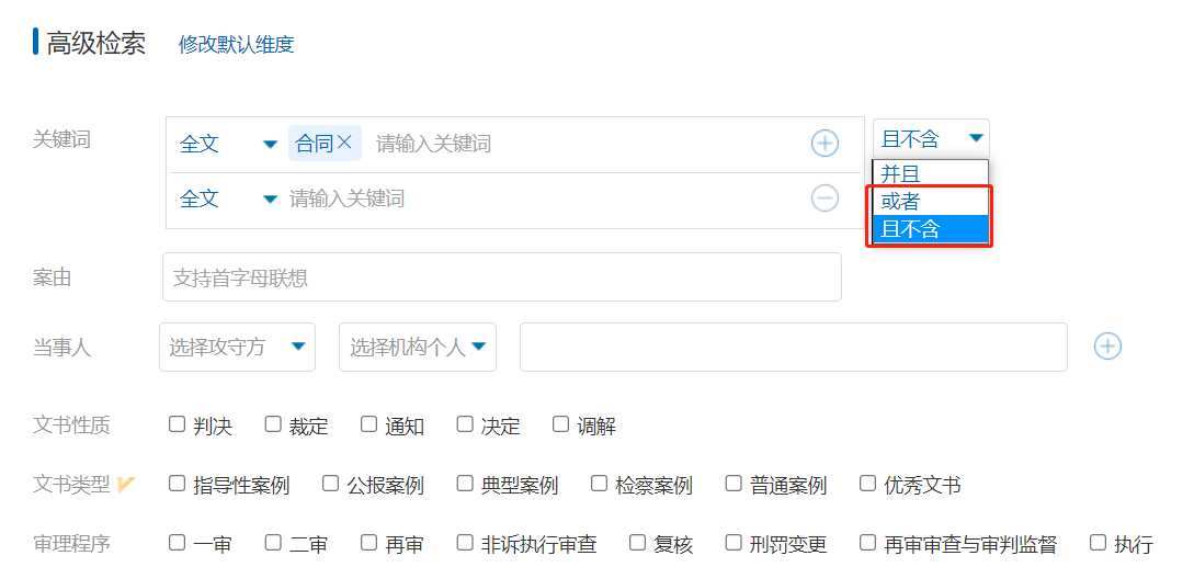 除支持標(biāo)題、案由、審判人員角色等區(qū)段的交叉檢索外,高級檢索還實(shí)現(xiàn)了同句檢索、同段檢索及關(guān)鍵詞剔除檢索,還支持增加近義詞功能,全方位精準(zhǔn)定位裁判信息,讓每個(gè)法律人秒變檢索高手。
