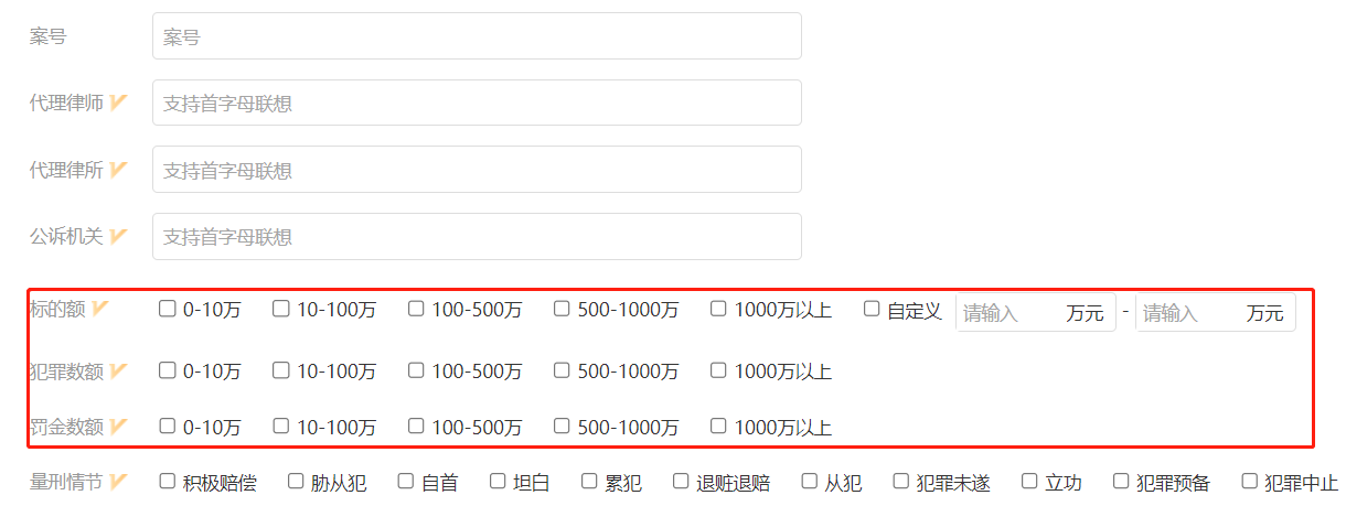 高級檢索還支持?jǐn)?shù)字檢索,用戶只需輸入一個(gè)數(shù)字范圍即可實(shí)現(xiàn)精準(zhǔn)而全面的檢索?!皹?biāo)的額、犯罪數(shù)額、罰金數(shù)額”均可以按數(shù)字范圍檢索。如下圖: