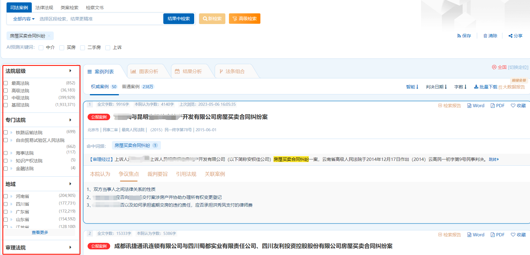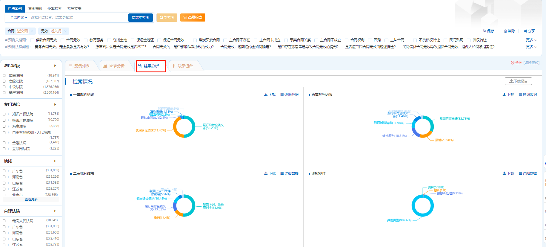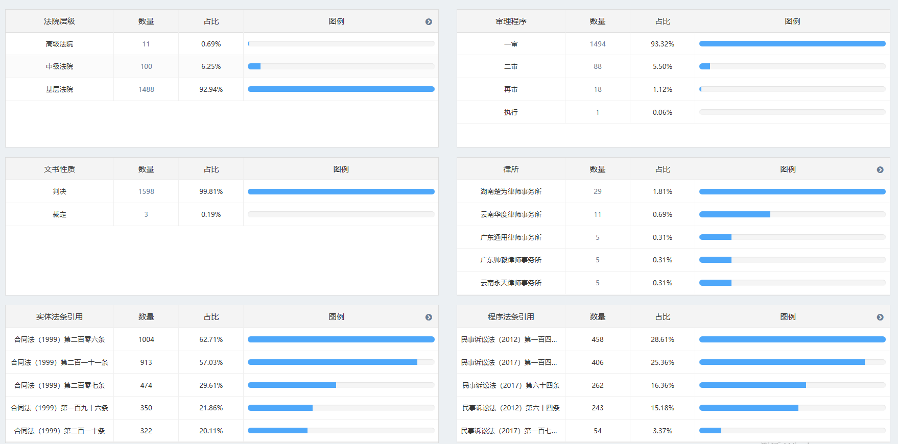 系統(tǒng)根據(jù)檢索結(jié)果自動對法院層級、審理程序、文書性質(zhì)、律所、實(shí)體法條引用、程序法條引用維度進(jìn)行數(shù)據(jù)分析,以視圖的形式直觀展示出來。
