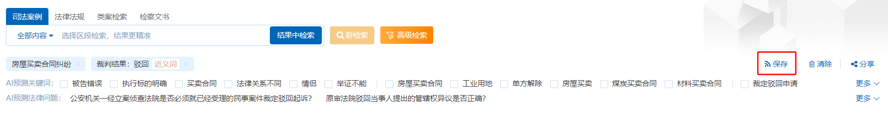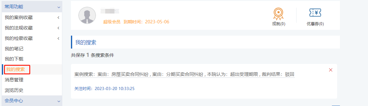 對于登錄的用戶,聚法案例提供保存檢索條件功能,某些關(guān)鍵詞可能是會多次檢索并且想要長期關(guān)注的,這時(shí)可以點(diǎn)擊【保存條件】,將該檢索條件保存在 “個(gè)人中心”的“我的搜索”中。