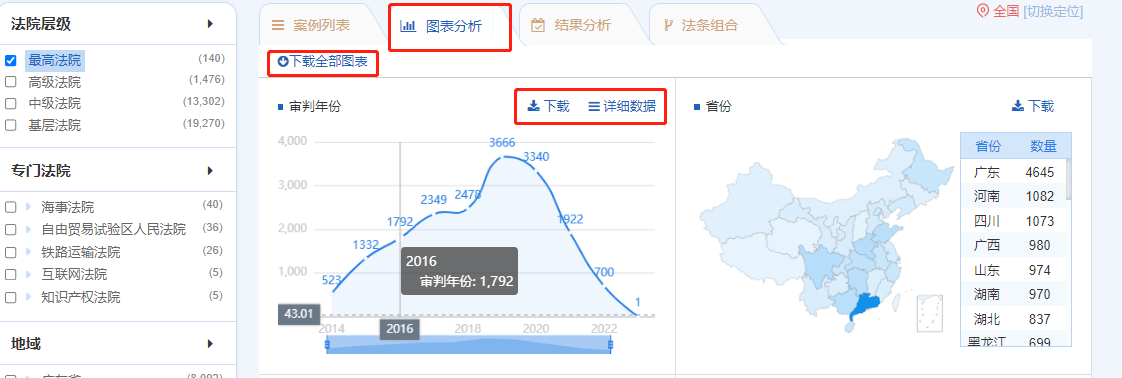 用戶可以在確定檢索條件及檢索結(jié)果后,在檢索結(jié)果頁點(diǎn)擊【圖表分析】,切換至可視化檢索,系統(tǒng)通過“審判年份、省份、案件類型、案由、實(shí)體法條引用、程序法條引用、文書類型、審理程序、法院層級、律所、律師”等維度對檢索結(jié)果進(jìn)行數(shù)據(jù)分析。