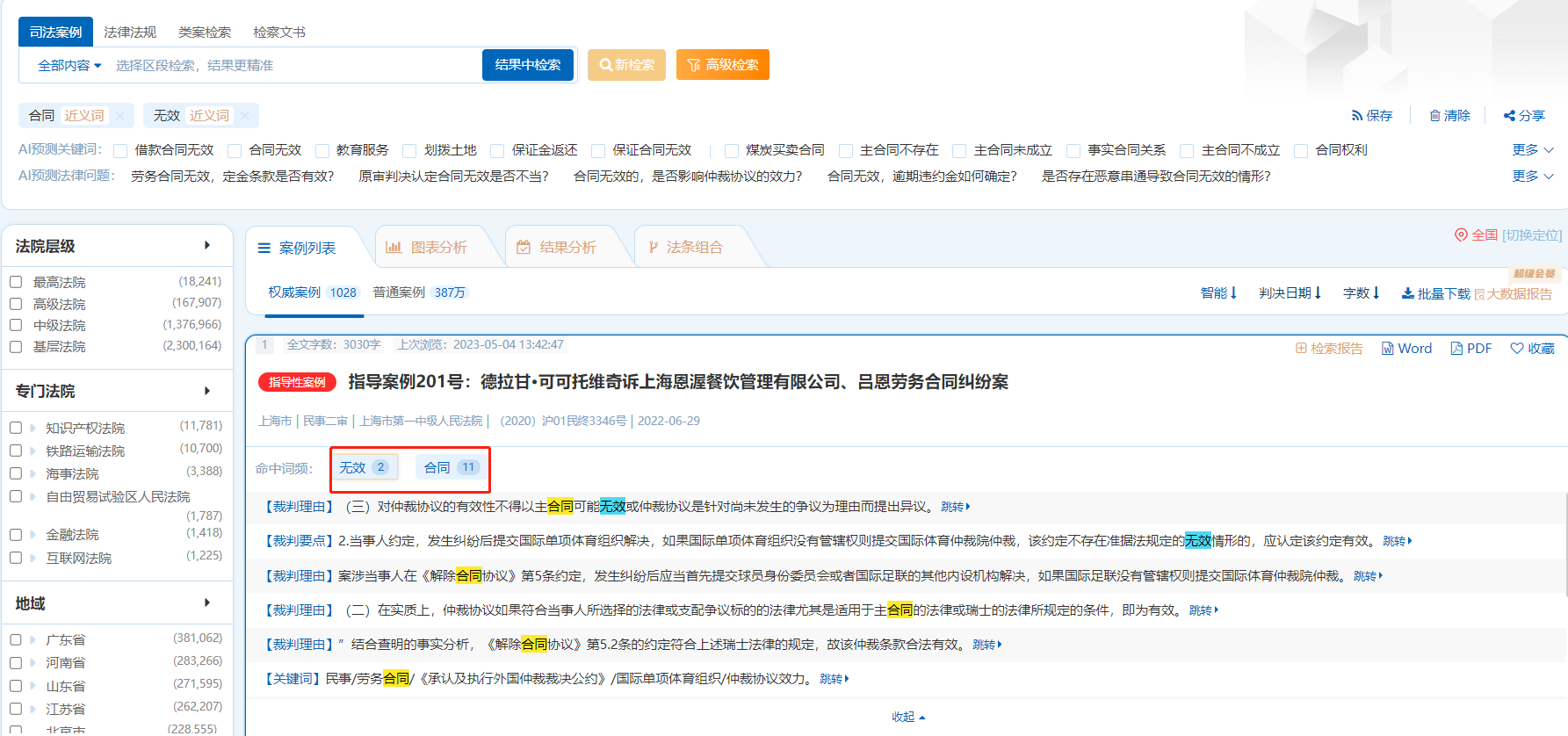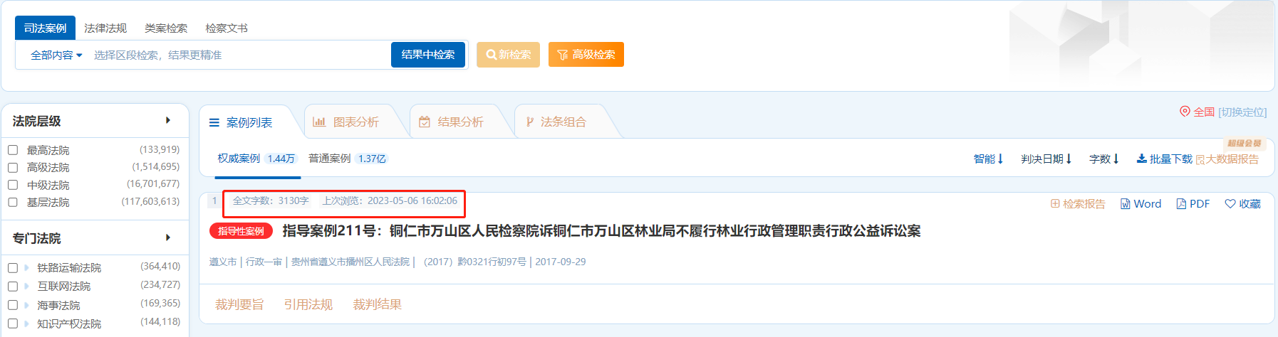 檢察文書檢索結(jié)果頁同樣有“命中詞頻”展示功能,可以很直觀的查看詞頻命中次數(shù)和命中位置,并且下方可以查看“本院認(rèn)為”和“引用法規(guī)”等案件信息。