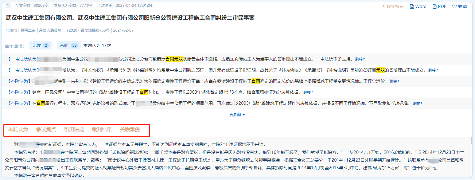 在案例詳情頁系統(tǒng)將訴訟請求和爭議焦點(diǎn)內(nèi)容,高亮標(biāo)識方便用戶快速鎖定重點(diǎn)。