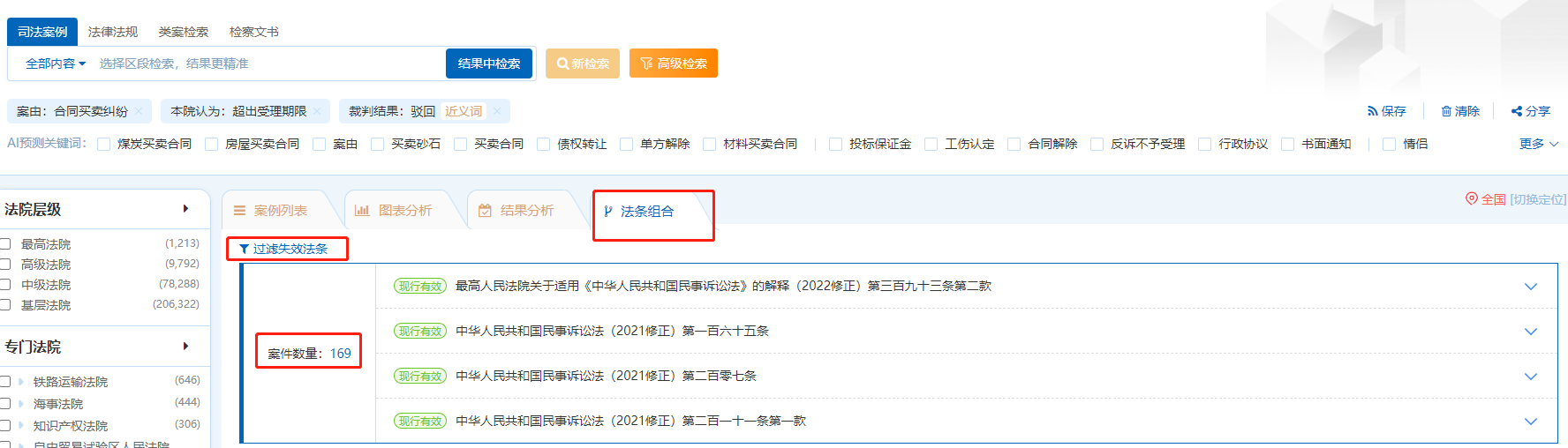 點(diǎn)擊【過濾失效法條】可以將法條組合當(dāng)中時(shí)效性為“失效/廢止、已被修訂”的法條進(jìn)行過濾,只保留“現(xiàn)行有效”的法條組合;點(diǎn)擊“案件數(shù)量”后方的【數(shù)字】,可直接跳轉(zhuǎn)到引用該法條組合的所有案例頁面。