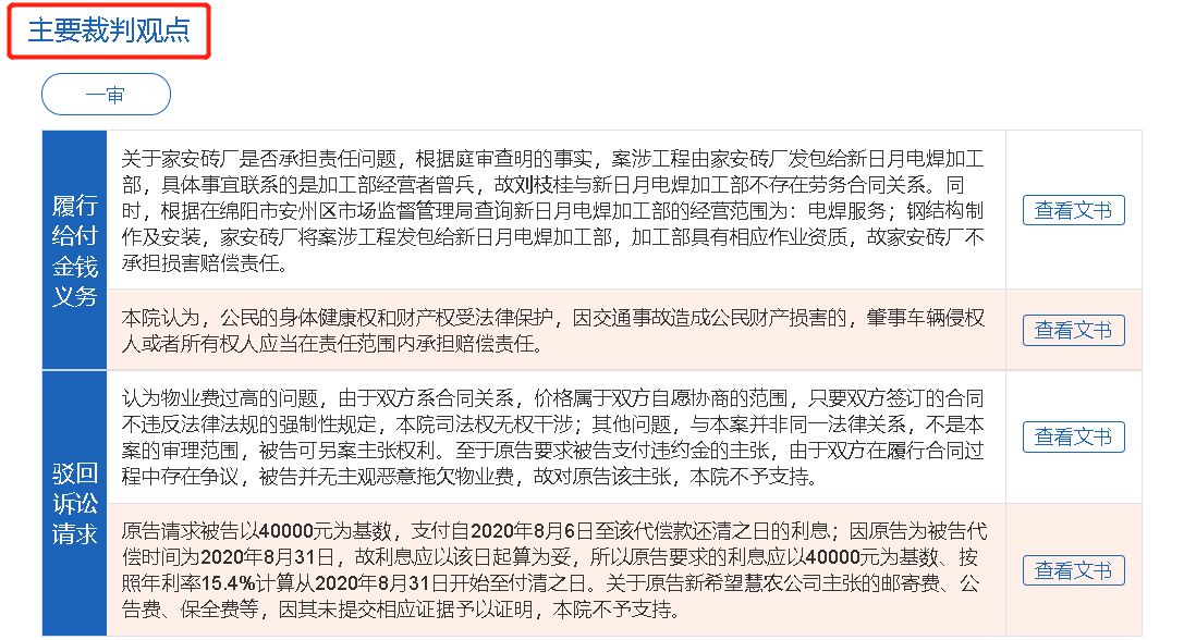系統(tǒng)將用戶較為關(guān)心的裁判結(jié)果對應(yīng)的裁判觀點(diǎn)進(jìn)行了展示。點(diǎn)擊【查看文書】可以查看案例原文。一審主要裁判觀點(diǎn)展示履行給付金錢義務(wù)、駁回訴訟請求、駁回起訴等裁判結(jié)果中案件數(shù)量最多的前兩項(xiàng)結(jié)果對應(yīng)的裁判觀點(diǎn);二審、再審案件展示發(fā)回重審和改判對應(yīng)的主要裁判觀點(diǎn)。