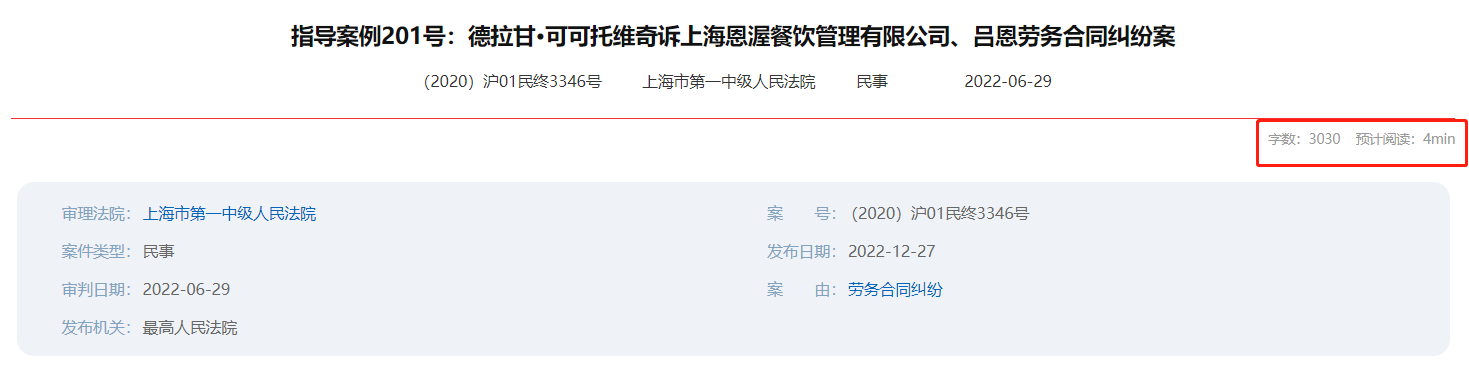 為了方便用戶在閱讀案例前估算閱讀時(shí)長,聚法案例采用人性化設(shè)計(jì),在文書詳情頁面上方展示了全文字?jǐn)?shù)和預(yù)計(jì)閱讀時(shí)間。