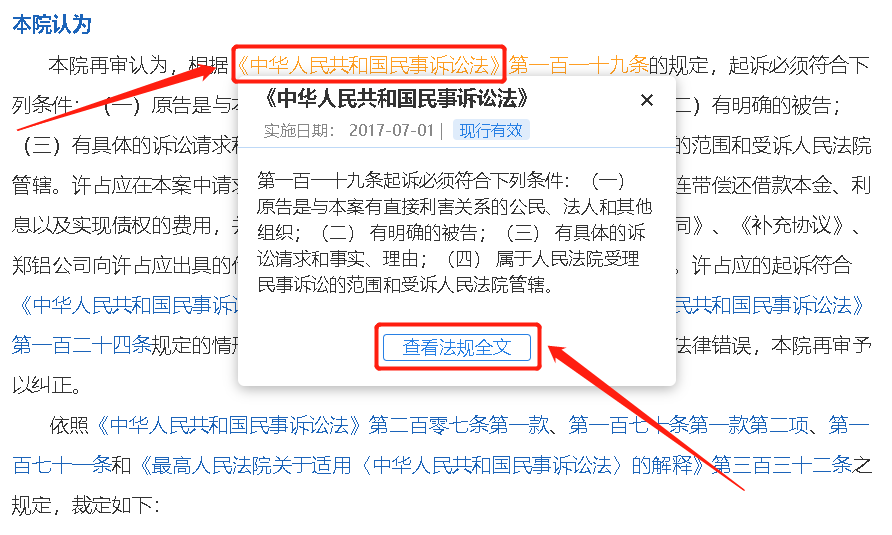 法律條文是法律文書的重要內(nèi)容,當(dāng)文書中出現(xiàn)法律條文引用,用戶點(diǎn)擊法條名稱,即可在下方展示所選法條全部內(nèi)容,還可以直接查看法規(guī)全文。