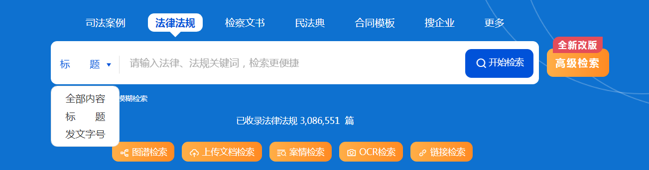 系統(tǒng)將法規(guī)切分為標(biāo)題和正文,在輸入關(guān)鍵詞之前,可以在輸入框左側(cè)欄中選擇“全部內(nèi)容”中檢索,或者“標(biāo)題”中檢索。