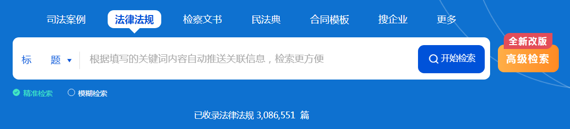 系統(tǒng)支持關(guān)鍵詞精準(zhǔn)檢索和模糊檢索。當(dāng)關(guān)鍵詞輸入后,可能因?yàn)檩斎氲牟粶?zhǔn)確導(dǎo)致該條件下無檢索結(jié)果。此時(shí)系統(tǒng)會自動由精準(zhǔn)檢索轉(zhuǎn)化為模糊檢索,根據(jù)已經(jīng)輸入的內(nèi)容,將關(guān)鍵詞進(jìn)行切分,并根據(jù)切分后的關(guān)鍵詞推送相關(guān)法規(guī)。