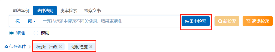 系統(tǒng)在區(qū)段檢索的基礎(chǔ)上還支持多區(qū)段的交叉搜索,即在法規(guī)不同的區(qū)段分別搜索關(guān)鍵詞,系統(tǒng)可綜合所有檢索條件后精準(zhǔn)提供檢索結(jié)果。例如在“標(biāo)題”中搜索“行政”,在此基礎(chǔ)之上,在“全文”中搜索“強(qiáng)制措施”,點(diǎn)擊【結(jié)果中檢索】按鈕,如下圖: