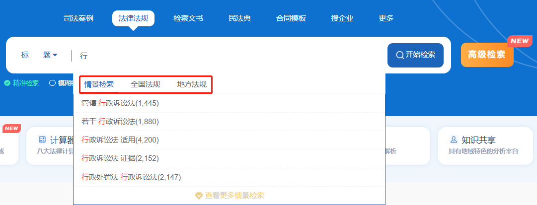 系統(tǒng)具有智能的聯(lián)想檢索功能,在關(guān)鍵詞輸入的過程中,根據(jù)已經(jīng)填寫的文字內(nèi)容自動推送關(guān)鍵詞等信息,有效幫助用戶確定搜索關(guān)鍵詞。點(diǎn)擊【地方法規(guī)】可切換聯(lián)想庫。