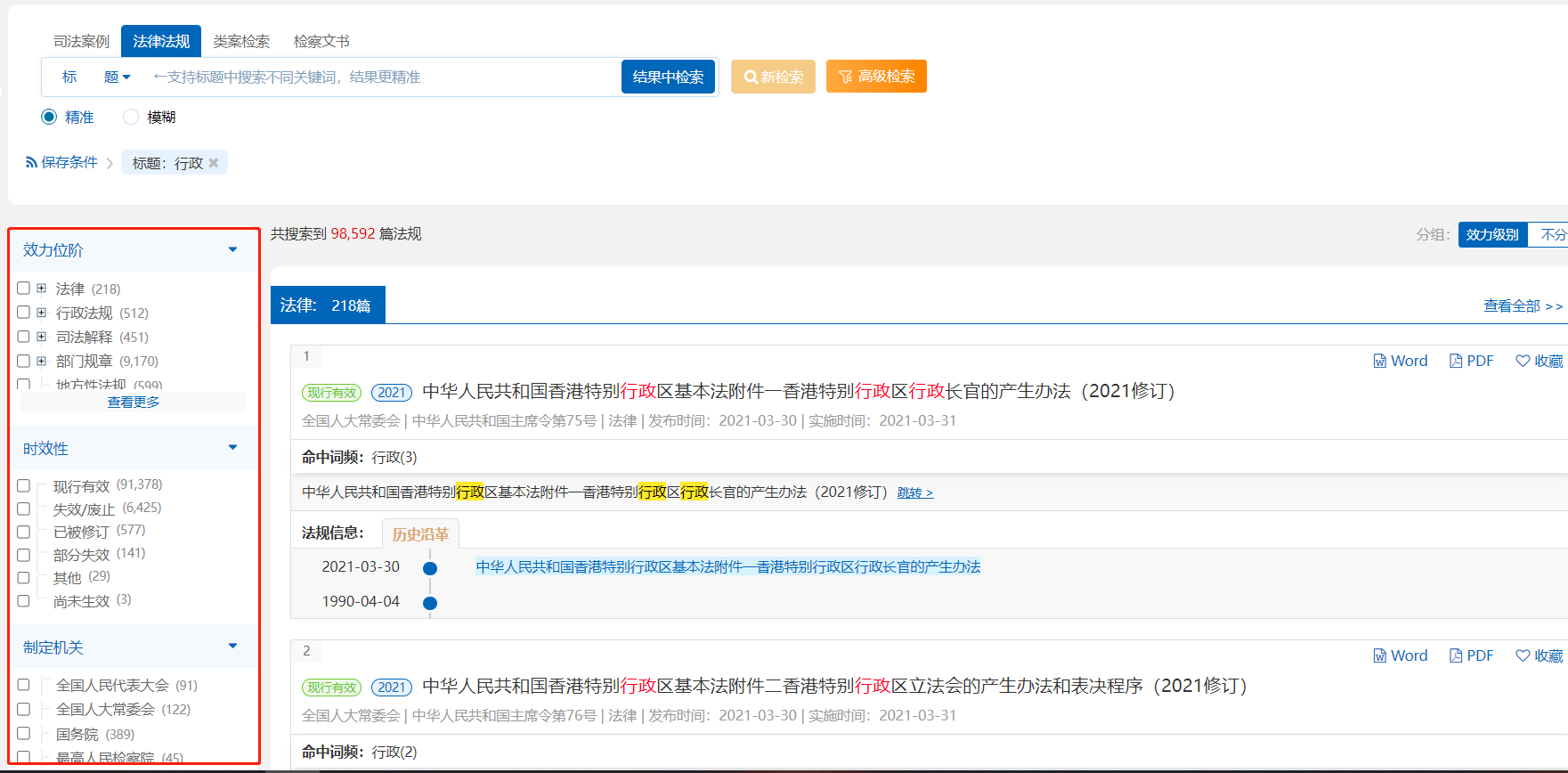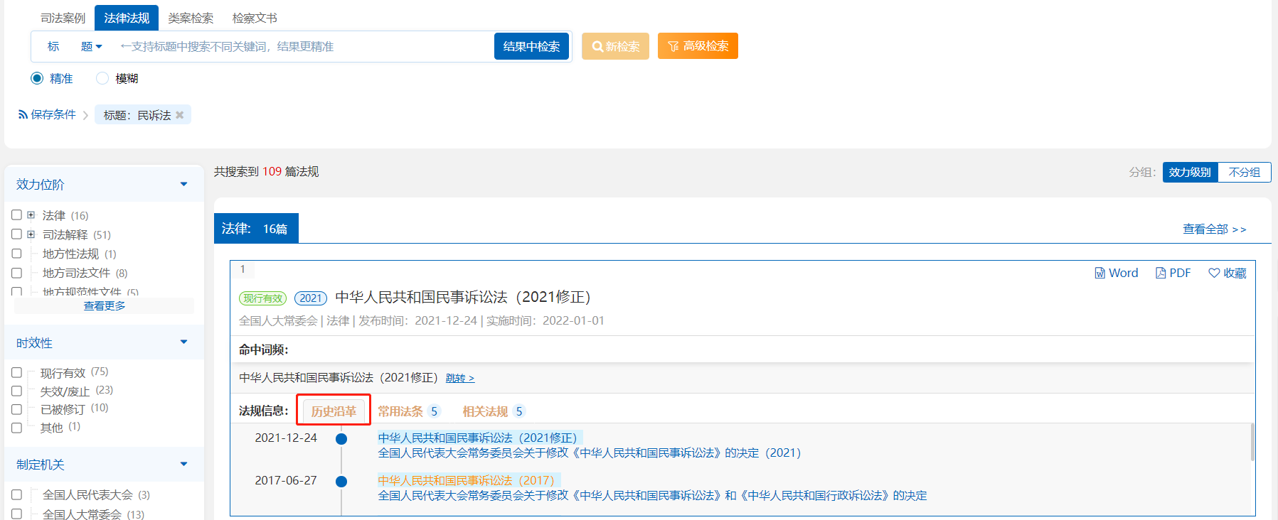 在法規(guī)檢索詳情展示頁面,用戶可快速了解法規(guī)歷史沿革。