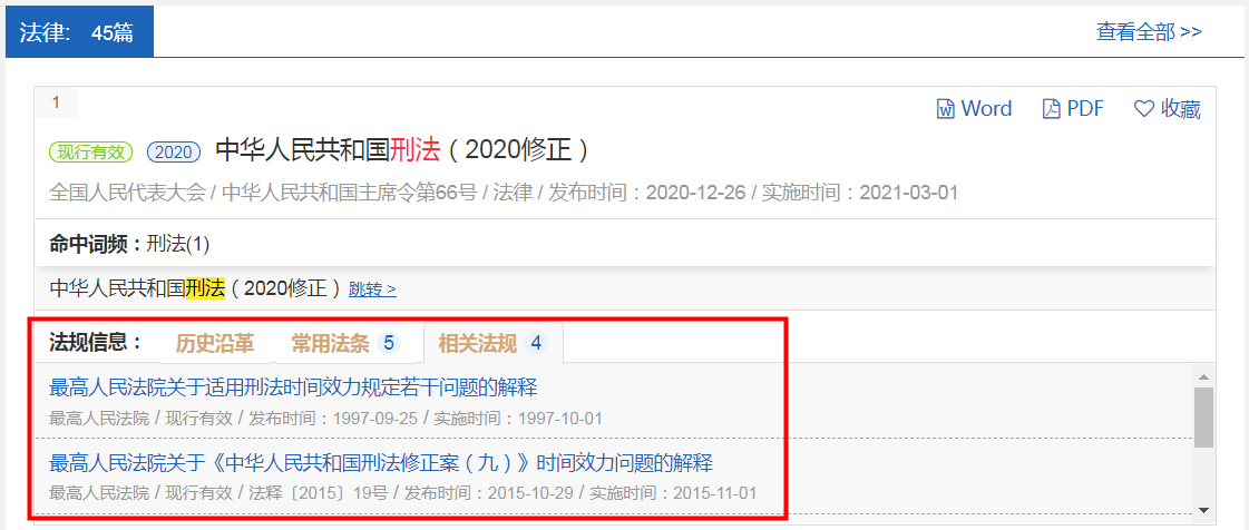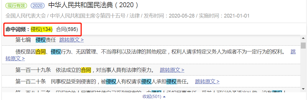 法規(guī)檢索也同樣具有“命中詞頻”功能,系統(tǒng)會將檢索詞在法規(guī)中出現(xiàn)的次數(shù)予以展示,有多個(gè)檢索詞時(shí)可以點(diǎn)擊查看其中一個(gè)詞所在原文中的位置。