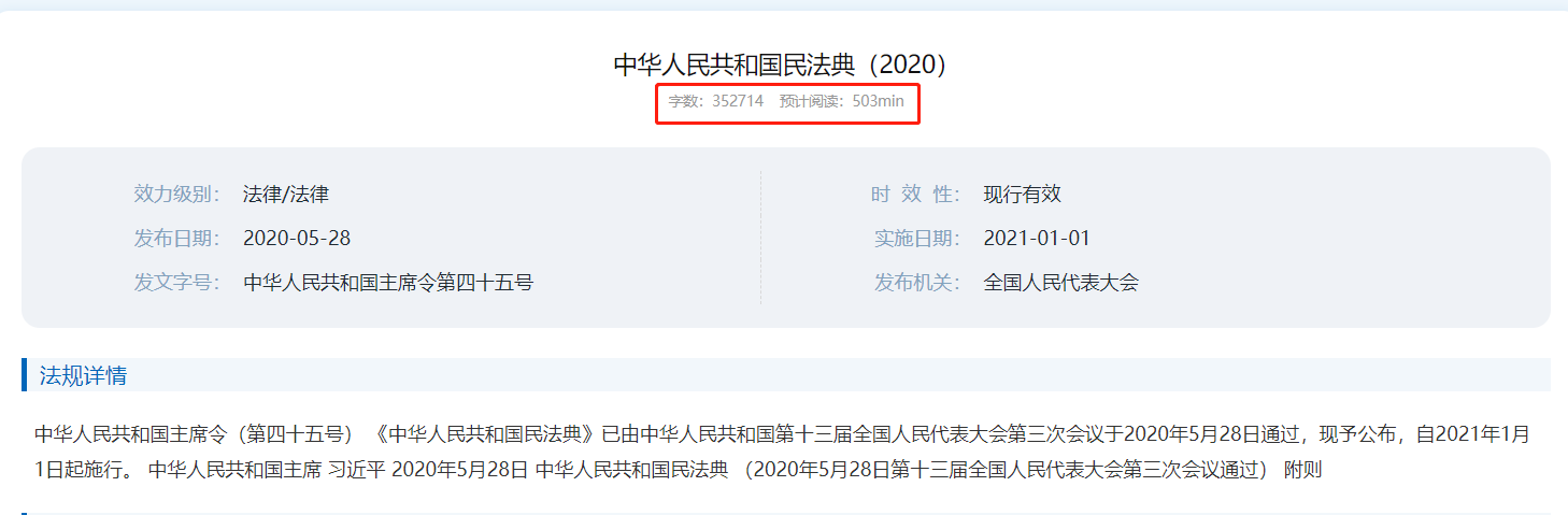 為了方便用戶在閱讀文書前估算閱讀時(shí)長,系統(tǒng)采用人性化設(shè)計(jì),在法規(guī)詳情頁面上方展示了全文“字?jǐn)?shù)”和“預(yù)計(jì)閱讀”時(shí)間。