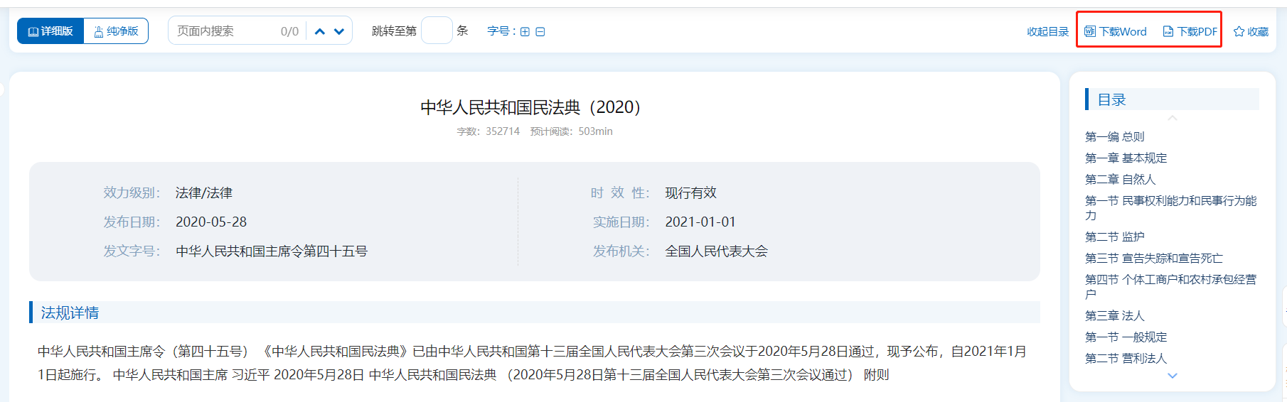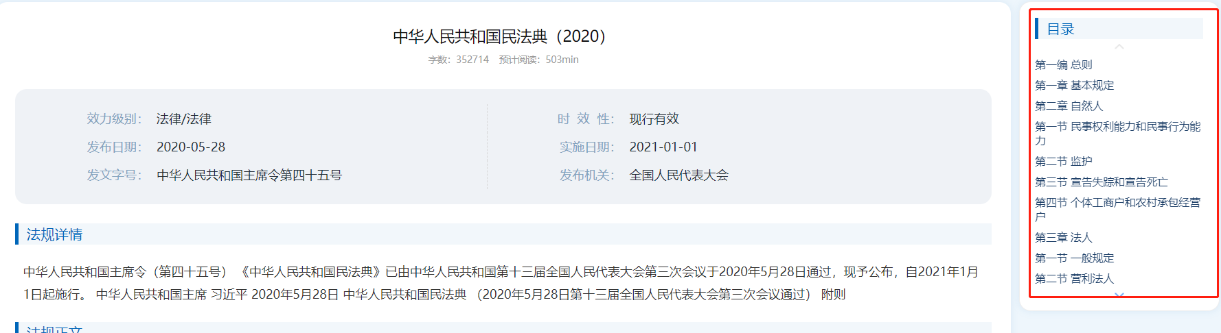 在法規(guī)檢索詳情頁面,系統(tǒng)提取了法規(guī)的編、章、節(jié)、條等內(nèi)容,形成目錄。點(diǎn)擊可直接跳轉(zhuǎn)到相應(yīng)位置。