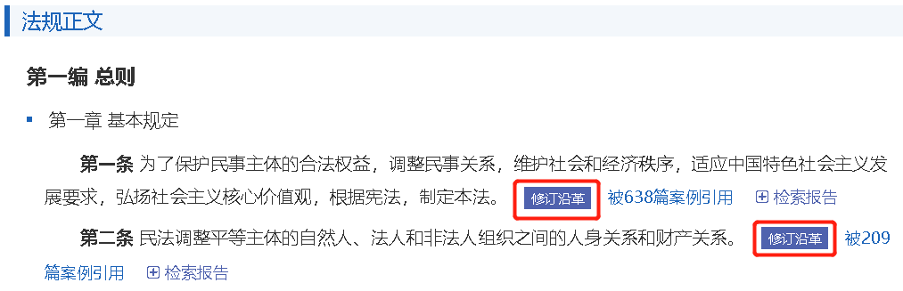 在法規(guī)檢索詳情頁面,若某一條法規(guī)被修訂過,用戶可直接點(diǎn)擊“修訂沿革”快速了解法條被修訂的具體情況。
