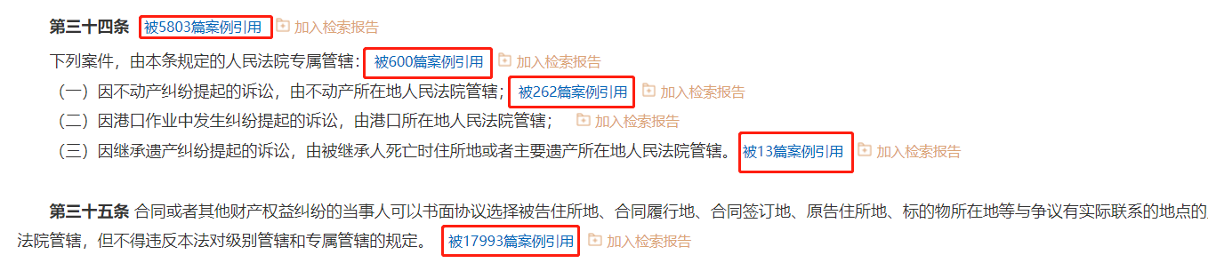 系統(tǒng)通過大數(shù)據(jù)分析,將每個(gè)法律條文被引用的情況進(jìn)行展示,用戶點(diǎn)擊“被X篇案例引用”,即可快速篩選引用過該法條的所有案例。