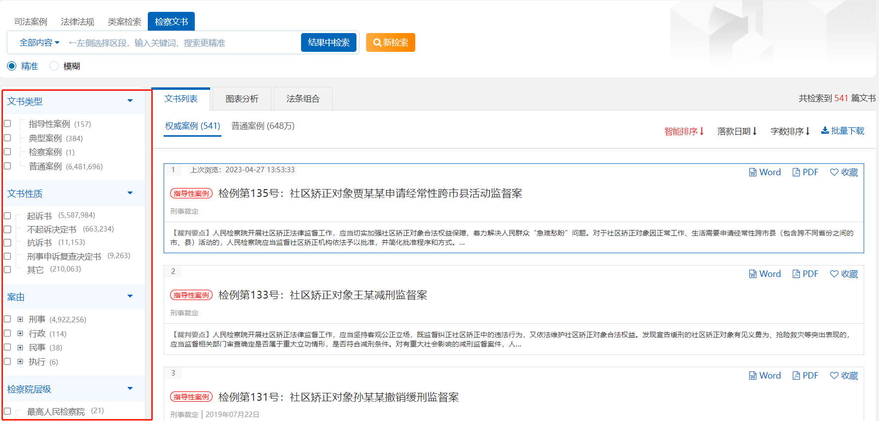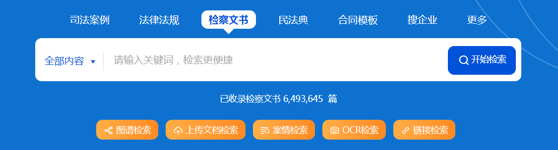 檢察文書的檢索方式同樣包括區(qū)段檢索、交叉檢索、在結(jié)果中檢索、聯(lián)想檢索、模糊檢索、可視化檢索、關(guān)鍵詞相關(guān)搜索等,用戶可以參照司法案例檢索功能的使用方式。