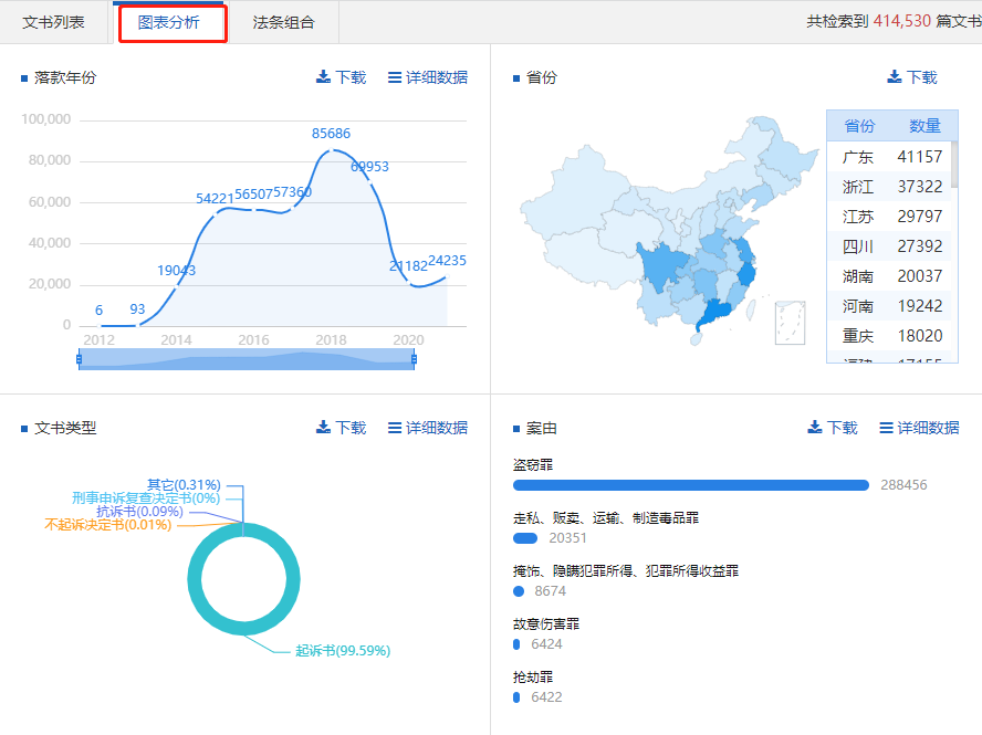 系統(tǒng)根據(jù)檢索結(jié)果自動對“落款年份、省份、文書類型、案由、檢察院層級和地域及檢察院”等維度進(jìn)行數(shù)據(jù)分析,以視圖的形式直觀展示出來。