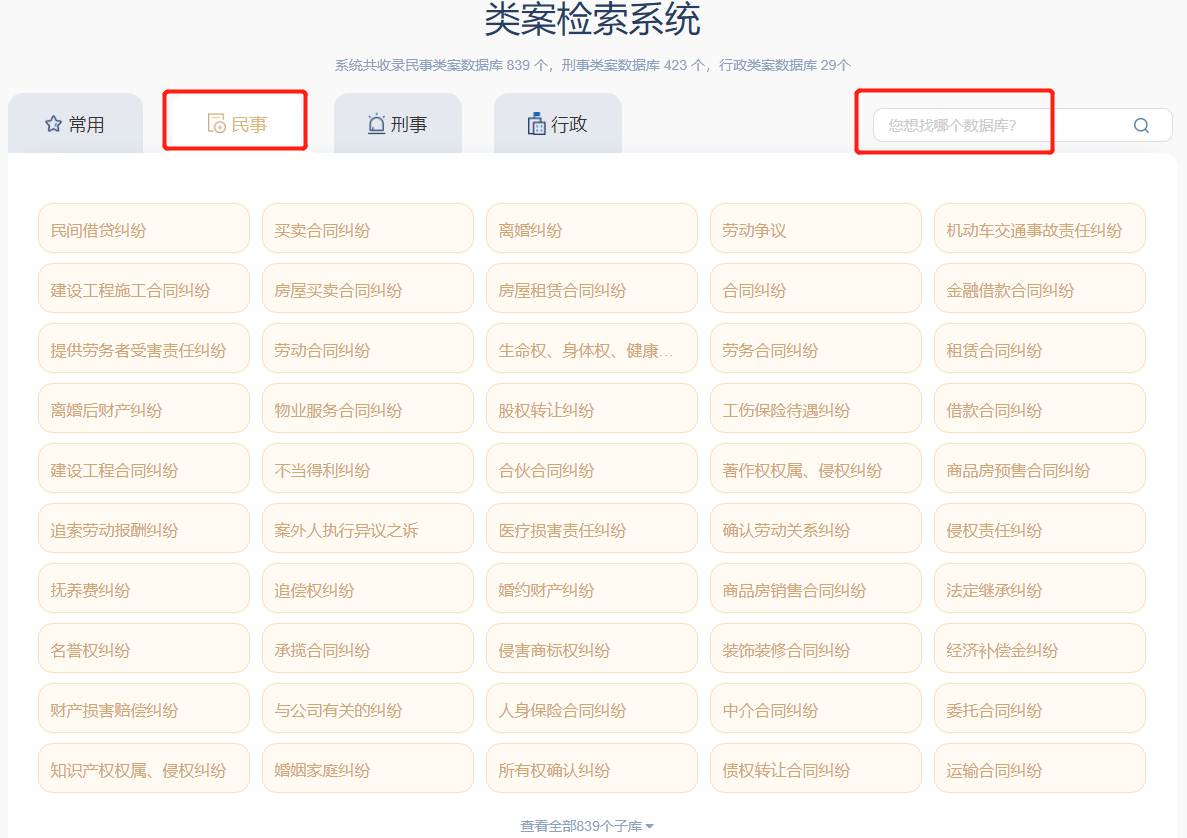 平臺包含839個(gè)子系統(tǒng),由常見的民事案由組成,按照案由案件數(shù)量倒序排列,覆蓋96%的民事案件。點(diǎn)擊【民事】,即可查看民事類案檢索系統(tǒng)項(xiàng)下的子系統(tǒng)。
