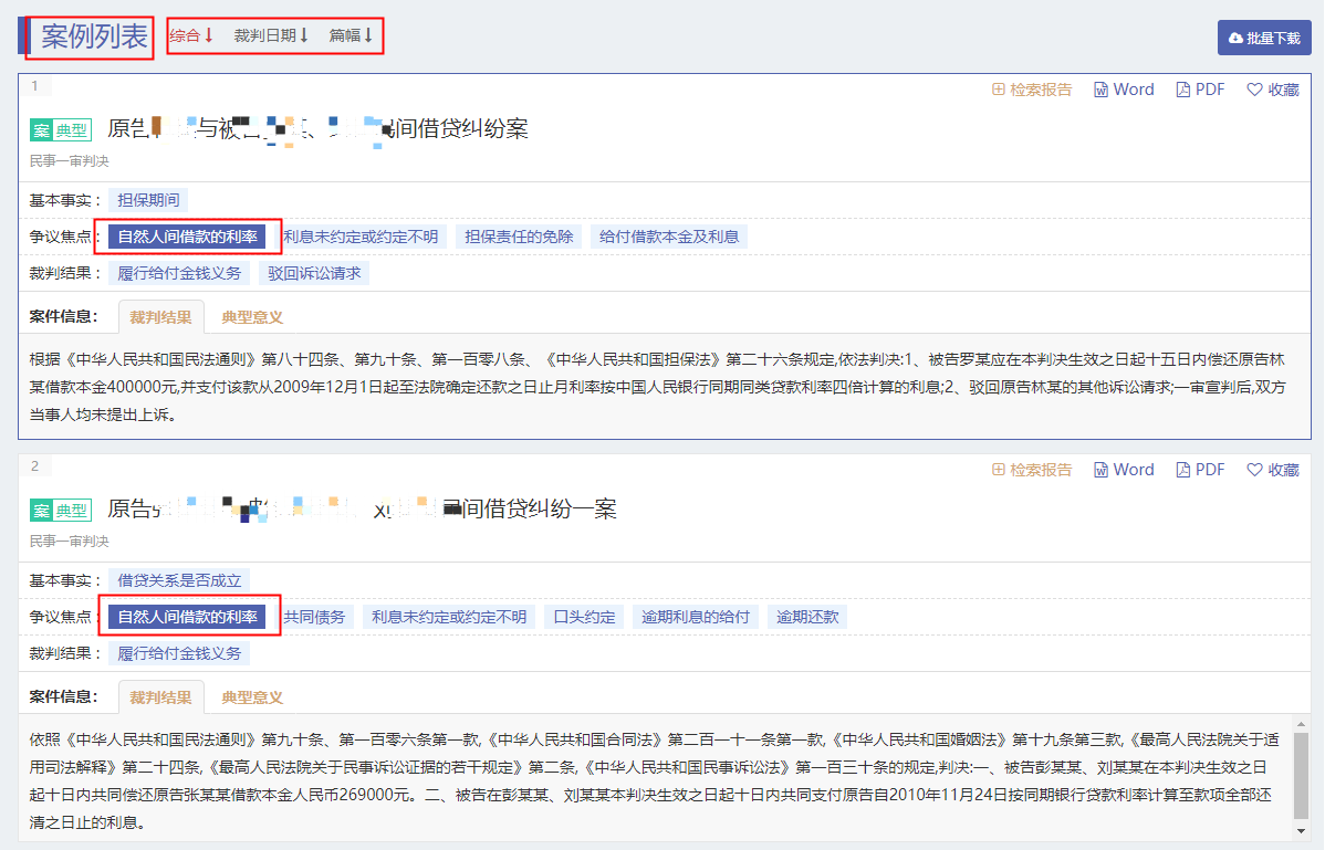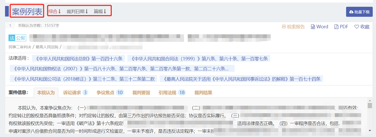 頁面下拉,到“案例列表”部分,即可看見該案由下的全部案例的具體內(nèi)容,可自行選擇類案的排序方式“綜合、裁判日期、篇幅”。