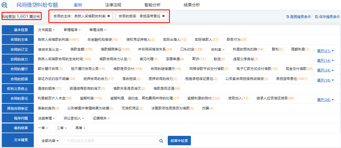同時(shí)還可以在搜索“自然人間借款的利率”的基礎(chǔ)上,再點(diǎn)擊任一搜索條件,進(jìn)行交叉檢索,以“承擔(dān)連帶責(zé)任”為例,可以明顯的看到,在兩個(gè)條件交叉檢索的情況下,檢索出來的類案數(shù)量大大降低,更利于快速高效地篩選類案。