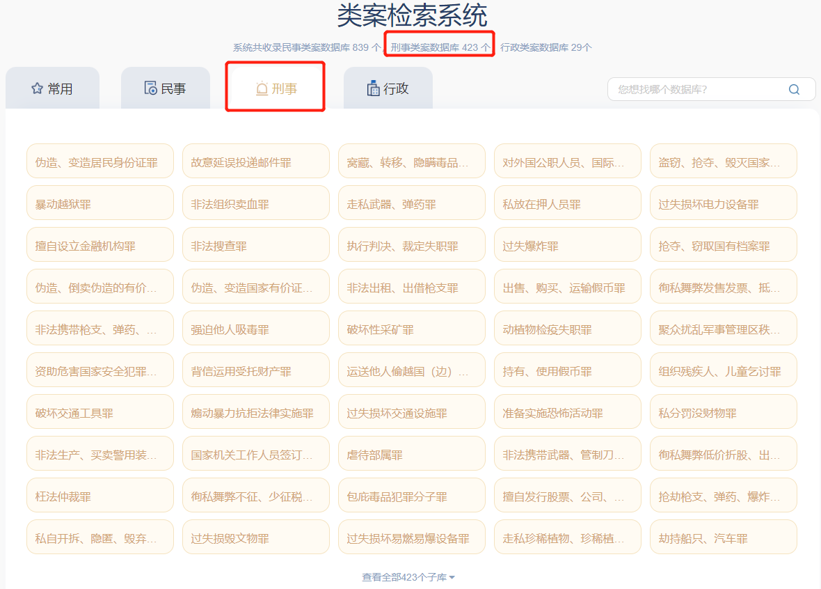 點(diǎn)擊【刑事】即可查看刑事類案推送系統(tǒng)項(xiàng)下的423個(gè)子系統(tǒng)即423個(gè)罪名。