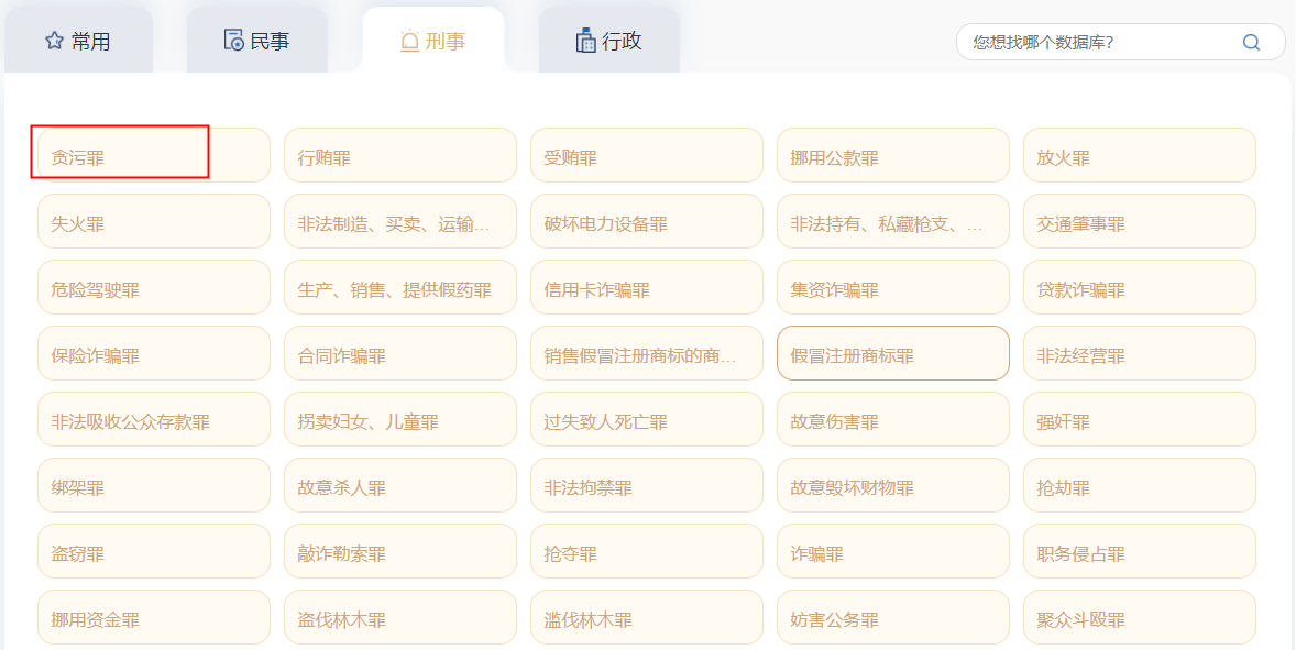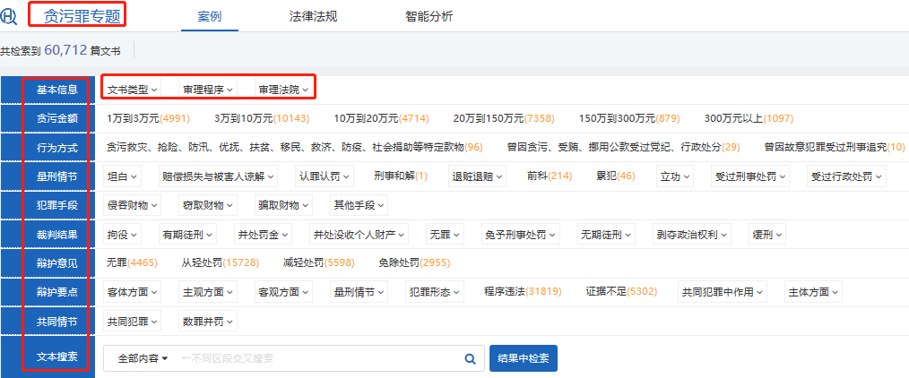 點(diǎn)擊任一罪名,即可查看罪名相關(guān)的類案,以貪污罪為例,點(diǎn)擊“貪污罪”,即可進(jìn)入貪污罪的類案檢索系統(tǒng),有多種維度、條件均可點(diǎn)選、交叉檢索(同民事類案推送)。