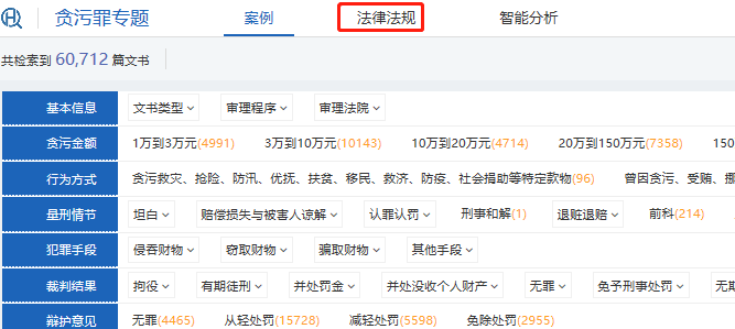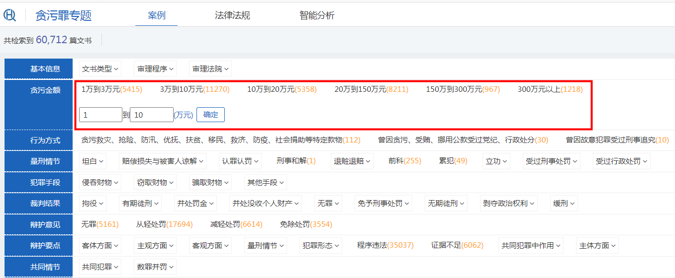 刑事類案檢索子庫還包含數(shù)字檢索,用戶可按一定數(shù)字范圍檢索案例。例如點(diǎn)擊貪污金額后方的數(shù)字范圍: