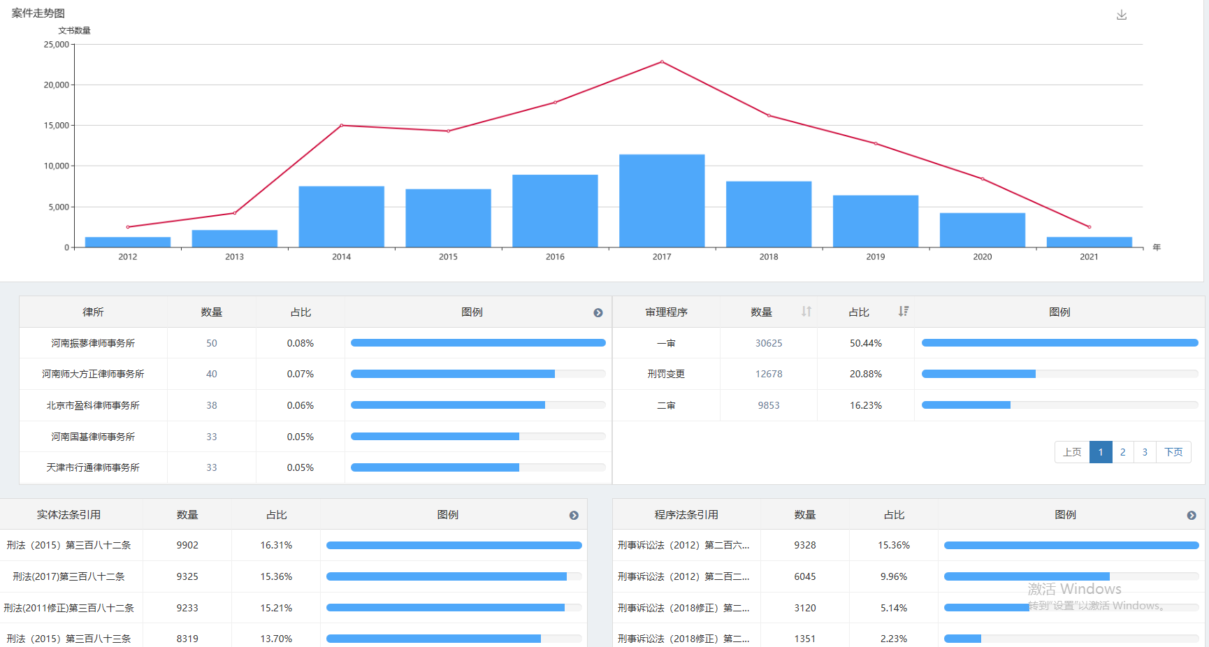 同時(shí)系統(tǒng)根據(jù)檢索結(jié)果自動對“案件走勢圖、律所、審理程序、實(shí)體法條引用、程序法條引用”等維度進(jìn)行數(shù)據(jù)分析,以視圖的形式直觀展示出來。