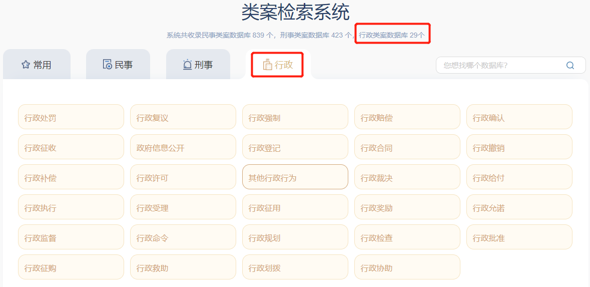 點(diǎn)擊【行政】,即可顯示行政的類案檢索系統(tǒng)項(xiàng)下的29個(gè)子系統(tǒng)即29個(gè)案由,如下圖: