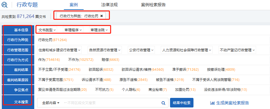 任意點(diǎn)擊一個(gè)案由,即可查看該案由下的全部裁判文書,以“行政處罰”為例,行政類案檢索同樣有多種維度和條件,點(diǎn)擊即可開始檢索,頁面下方是“案例列表”部分,對每篇推送的案例均有詳細(xì)分析,如下圖: