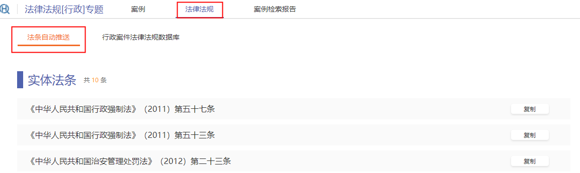 點(diǎn)擊【法律法規(guī)】,即可進(jìn)入“法條自動推送”系統(tǒng),查看行政案例中使用頻率由高到低排序的法條,點(diǎn)擊法條標(biāo)題即可查看具體內(nèi)容,如下圖: