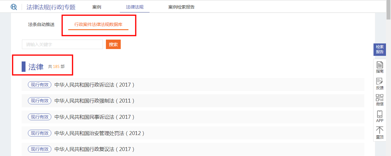 點(diǎn)擊【行政案件法律法規(guī)數(shù)據(jù)庫】,即可查看行政案件涉及到的全部法律法規(guī),點(diǎn)擊即可查看法律法規(guī)的具體內(nèi)容,如下圖:
