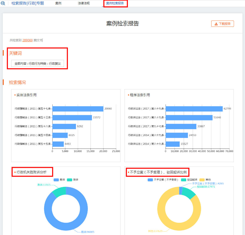 點(diǎn)擊【案例檢索報(bào)告】,即可查看圖表版的類案檢索統(tǒng)計(jì)與分析,該報(bào)告分為三個(gè)部分,第一個(gè)部分是檢索關(guān)鍵詞展示,第二部分是“檢索情況”,對檢索的類案的“法條引用”情況,“行政機(jī)關(guān)勝敗訴”情況,“不予立案(不予受理)、駁回起訴比例”進(jìn)行可視化展示。