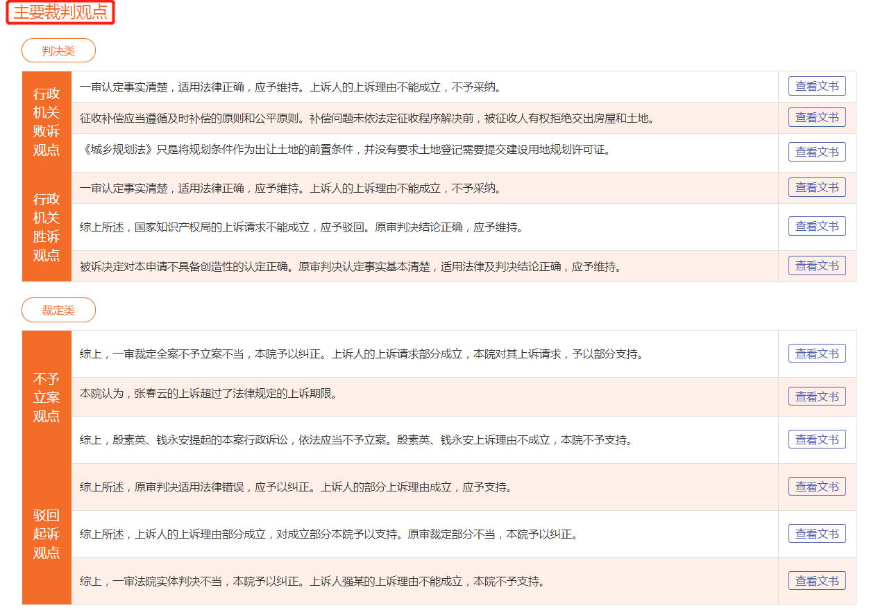 第三部分是“主要裁判觀點(diǎn)”,系統(tǒng)對搜索出來的每篇案例自動提取出裁判觀點(diǎn)進(jìn)行展示。點(diǎn)擊【查看文書】可以查看該觀點(diǎn)對應(yīng)的文書詳情。