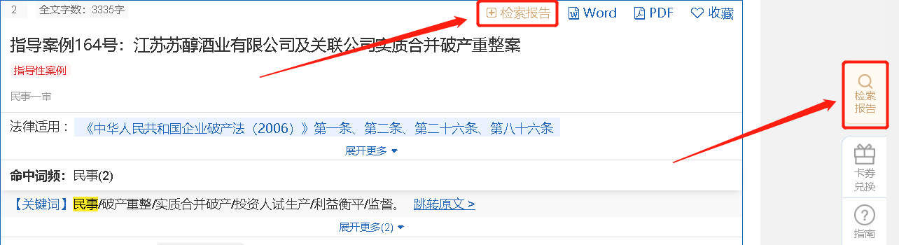 在檢索結(jié)果頁,用戶可通過“命中詞頻”模塊的命中頻次展示、命中位置展示、高亮標(biāo)識、跳轉(zhuǎn)原文四大功能,在檢索結(jié)果列表頁直觀清晰地查看關(guān)鍵詞命中詳情,無需打開原文閱讀,為快速判斷文書內(nèi)容提供便利。點(diǎn)擊“命中詞頻”后面的關(guān)鍵詞,關(guān)鍵詞會標(biāo)藍(lán)展示,并且跳轉(zhuǎn)到該詞所在位置。點(diǎn)擊命中詞所在原文語句后方的【跳轉(zhuǎn)】按鈕,可直接跳轉(zhuǎn)到案例詳情頁該語句所在位置,方便用戶快速查看重要內(nèi)容。